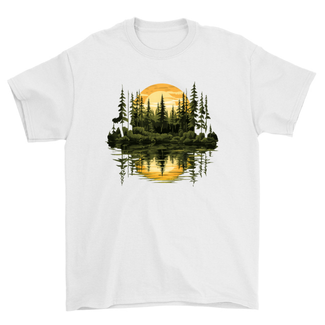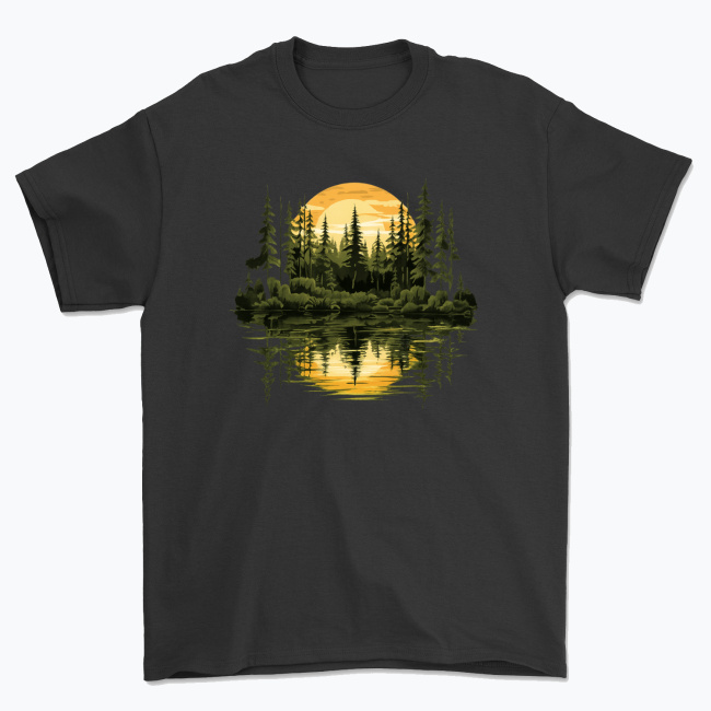 Ilustracja lasu odbijającego się w wodzie na tle zachodzącego słońca. Dominują odcienie złota, żółci i głębokiej zieleni, które na czarnym tle tworzą elegancki, spokojny i ponadczasowy efekt. Trwały nadruk odporny na spieranie, idealny do codziennego noszenia.