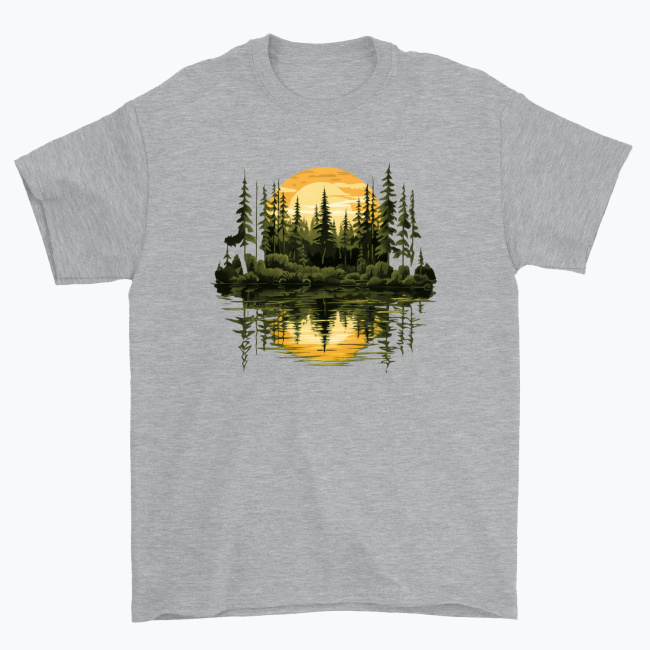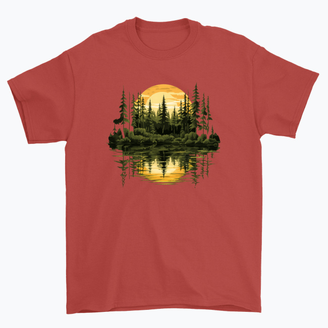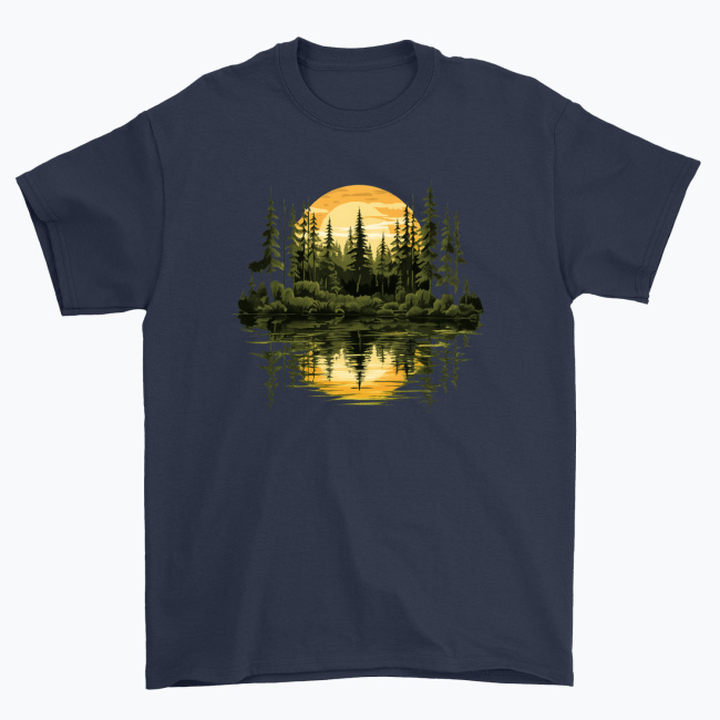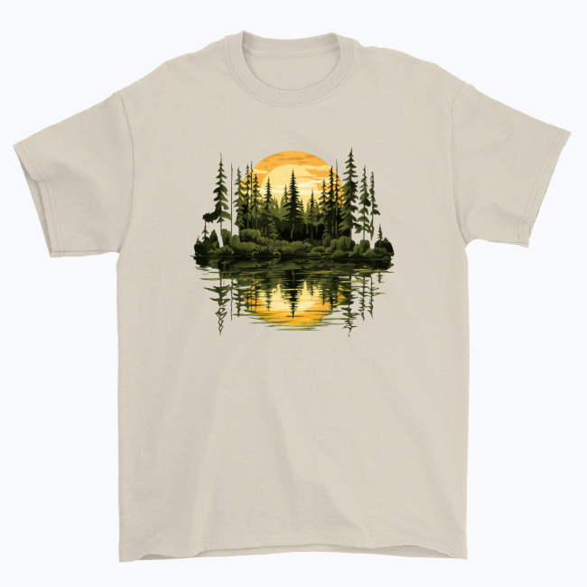 Cisza, natura i złote światło zachodzącego słońca zamknięte w artystycznej ilustracji. Koszulka „Sunset Forest Reflection” przedstawia majestatyczny las iglasty skąpany w ciepłych, złoto-miodowych promieniach słońca, które odbijają się w spokojnej tafli wody. Symetryczna kompozycja tworzy efekt harmonii, równowagi i głębi, przywołując klimat wieczornego wyciszenia w sercu natury.