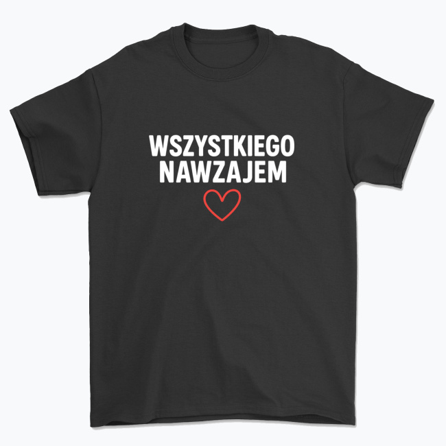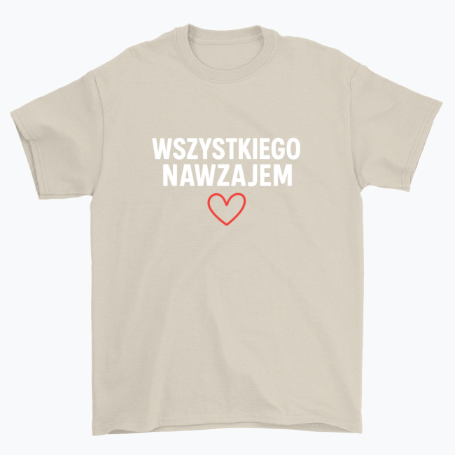 Koszulka „Wszystkiego Nawzajem” to prosta, ale genialna w swojej wymowie propozycja – idealna na urodziny, święta czy każdą inną okazję, kiedy trzeba szybko i z humorem „oddać” życzenia.