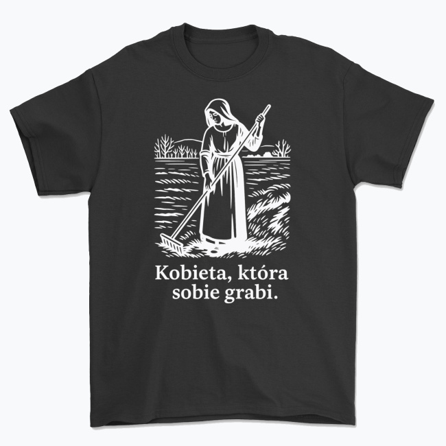 Ilustracja w stylu rustykalnej ryciny przedstawia kobietę z grabiami w ręku – ale nie daj się zwieść wiejskiemu klimatowi! Ten nadruk to gra słów z przymrużeniem oka. Dla kobiet, które wiedzą, czego chcą, i nie boją się po to sięgnąć – choćby grabiami.