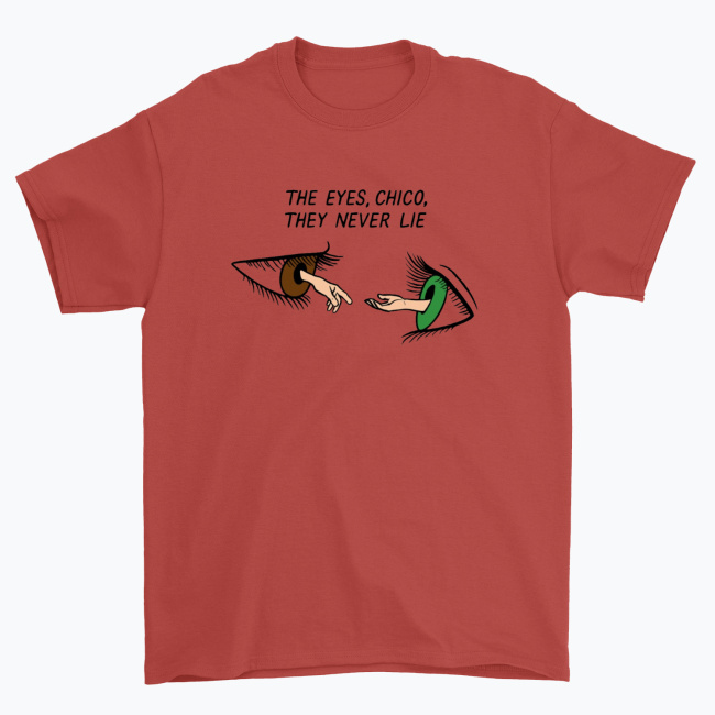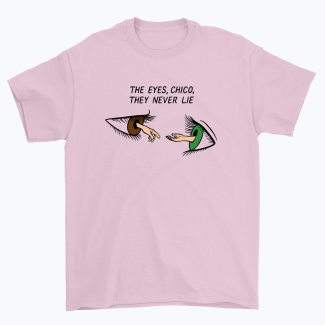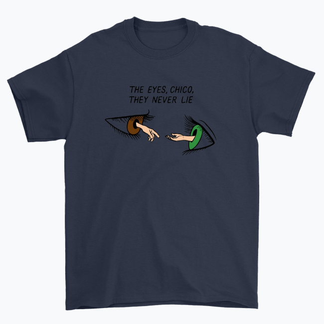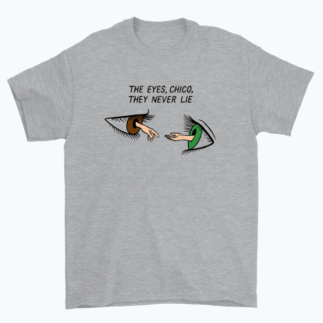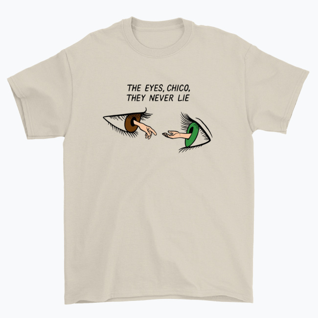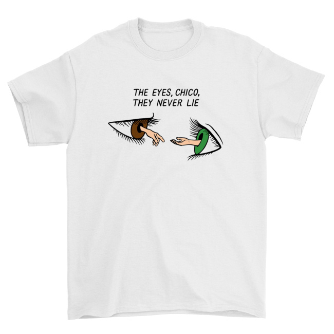 - Motyw: Dwa realistyczne oczy (brązowe i zielone) z wyciągniętymi dłońmi, cytat „The Eyes, Chico, They Never Lie” nad nimi